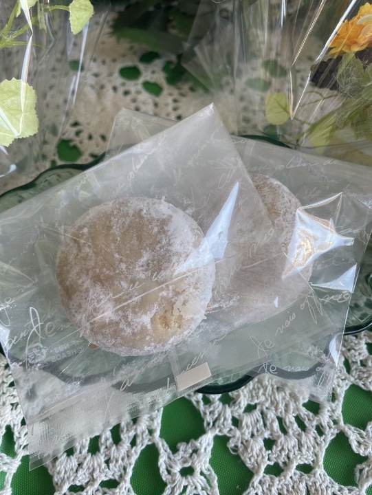 卵を使用せず生地にココアを練りこみ焼きあげ粉糖をまぶし、