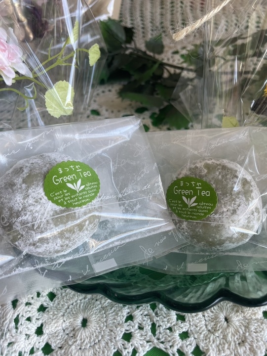 卵を使用せず生地に抹茶を練りこみ焼きあげ粉糖をまぶし、